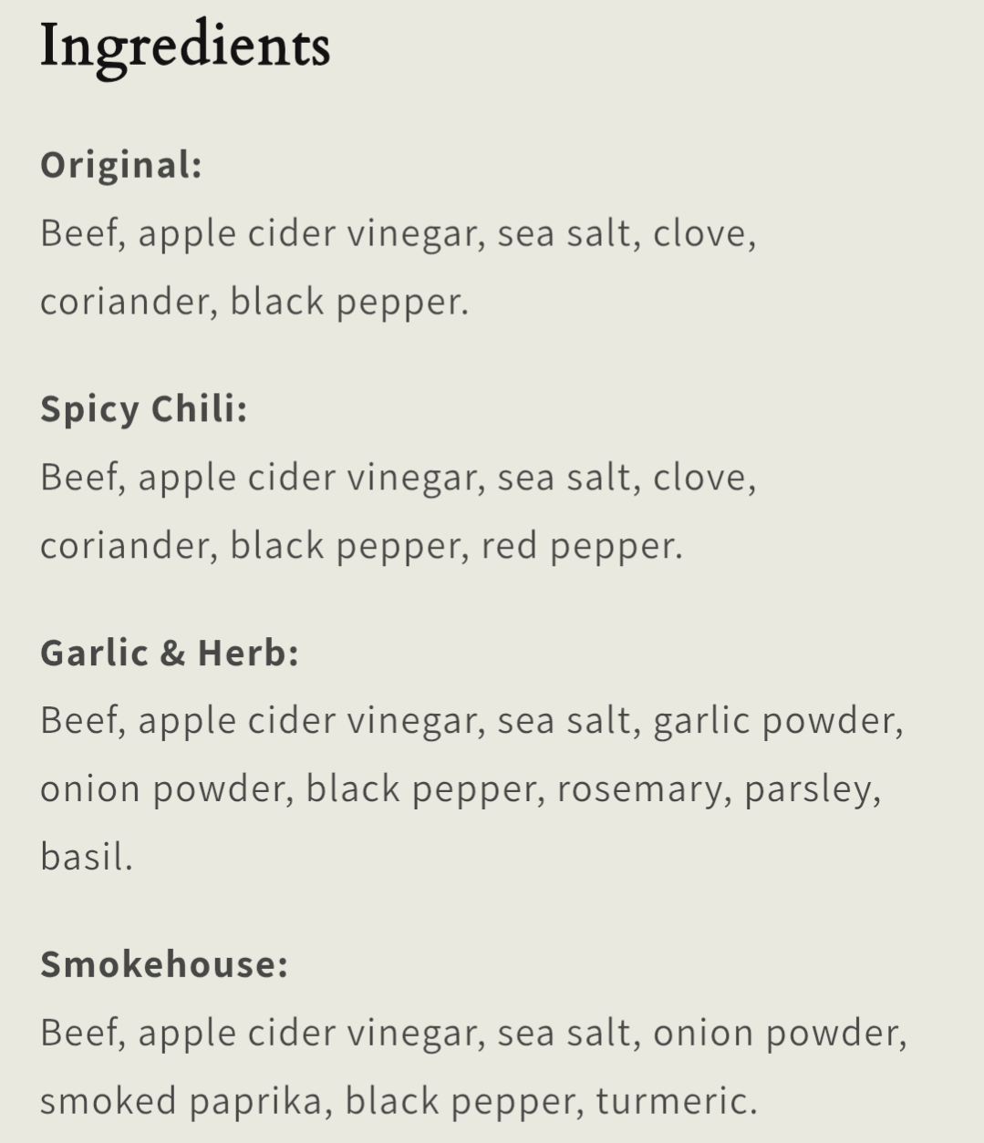 Beef, apple cider vinegar, sea salt, clove, coriander, black pepper.